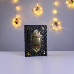 Elegant padded dotted Quran featuring a premium gold frame. Clear text and colors for comfortable reading. Compact size (13 × 17 cm), available in white and black.