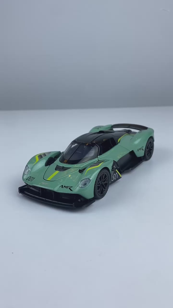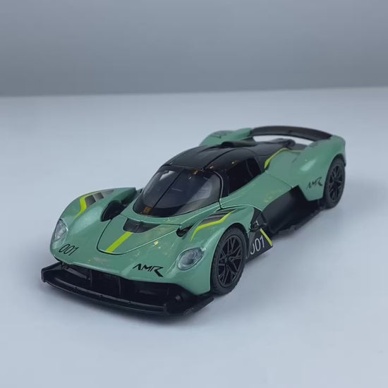 A detailed die-cast model of the Aston Martin Valkyrie AMR, designed to replicate the aggressive styling of the original hypercar. Ideal for collectors and car enthusiasts.